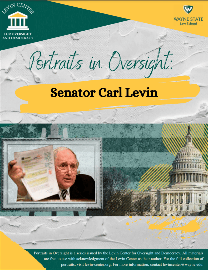 The Levin Portrait is the 16th in a series of profiles developed by the Levin Center to describe notable congressional oversight investigations and key figures in the history of legislative oversight. Together, the portraits explore congressional investigations from 1792 to the modern era including inquiries into the Civil War, Ku Klux Klan, covert intelligence operations, Iran-Contra affair, and Watergate as well as figures such as Representatives John Dingell and Elijah Cummings and Senators Harry Truman and Joe McCarthy.